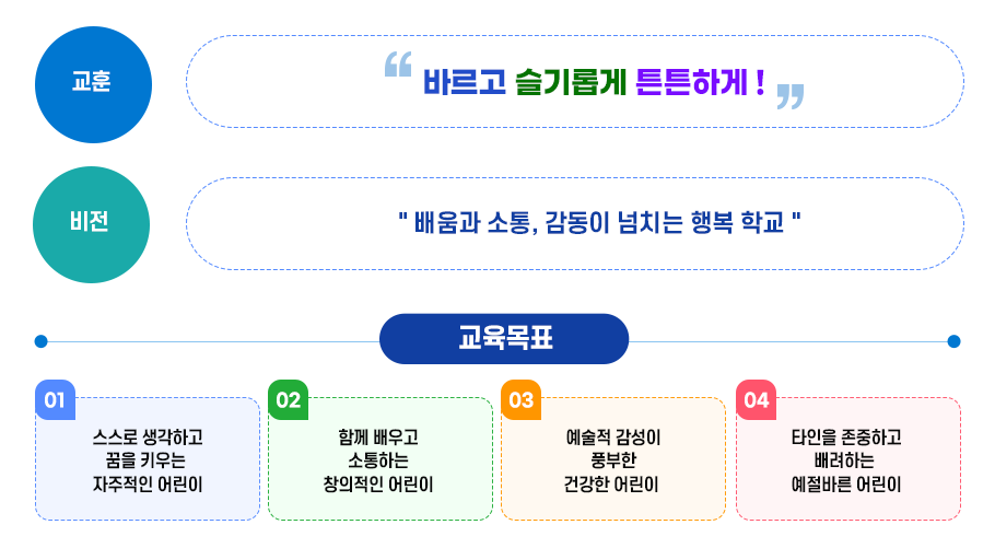 학교, 학생, 학부모가 한마음으로 행복한 교육공동체를 이루어 넓고, 푸른 잎처럼 큰 꿈을 이루는 사람을 키우자는 의미